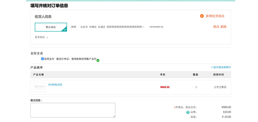 挑选商品后,核对产品名称、数量、金额等信息,点击“生成订单”进入确认下单页面, 填写收货人地址等信息。